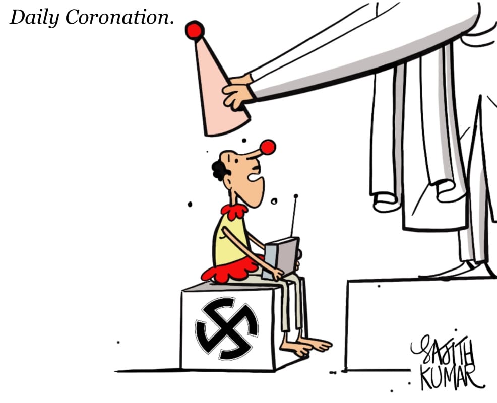 In today’s featured cartoon, Nala Ponnappa takes a dig at Britain’s ill-gotten acquisition of the Kohinoor diamond among its colonial spoils. His cartoon depicts a shuttered shop named “Kohinoor Jewellers” with a sign reading “We are at the Charles III London coronation”. The 105-carat controversial sparkler, however, did not make an appearance at the 6 May festivities as it was kept out of Queen Camilla’s violet crown.