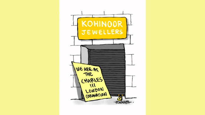 In today’s featured cartoon, Nala Ponnappa takes a dig at Britain’s ill-gotten acquisition of the Kohinoor diamond among its colonial spoils. His cartoon depicts a shuttered shop named “Kohinoor Jewellers” with a sign reading “We are at the Charles III London coronation”. The 105-carat controversial sparkler, however, did not make an appearance at the 6 May festivities as it was kept out of Queen Camilla’s violet crown.