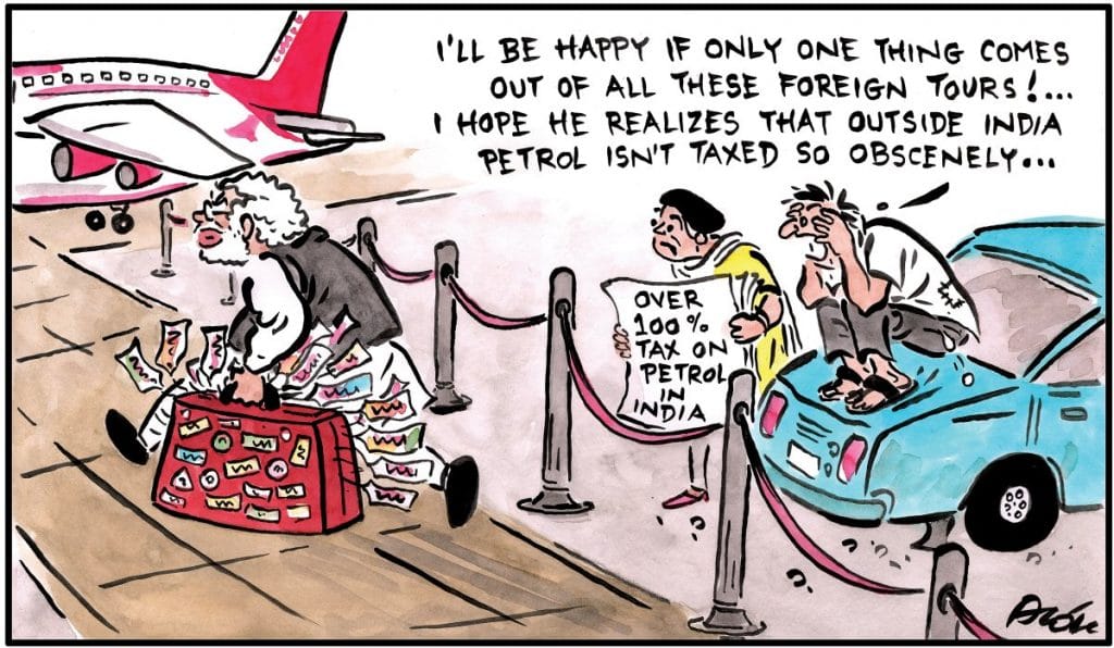 In his cartoon, Alok Nirantar illustrates that the only thing Narendra Modi should learn from his numerous foreign visits is that their tax rates on fuels are probably lower than India’s.