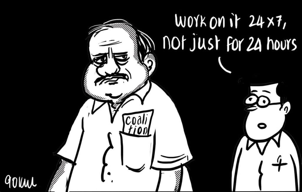 In Asian Age, Gokul Gopalakrishnan takes a jab at the coalition between former rivals JD(S) and Congress, showing a man advising Kumaraswamy to work on it 24*7.