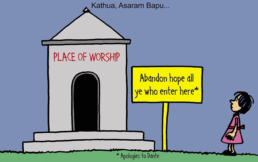 Most of the cartoons of the day dealt with self-proclaimed ‘godman’ Asaram’s conviction in the 2013 rape case of a teenage girl. R. Prasad shows how from Kathua to Asaram ashram, places of worship have become hell for children.