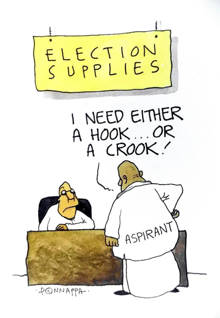 Nala Ponnappa draws the actual election supplies shop where politicians usually hang out: so that they can avail of hooks and crooks before elections.