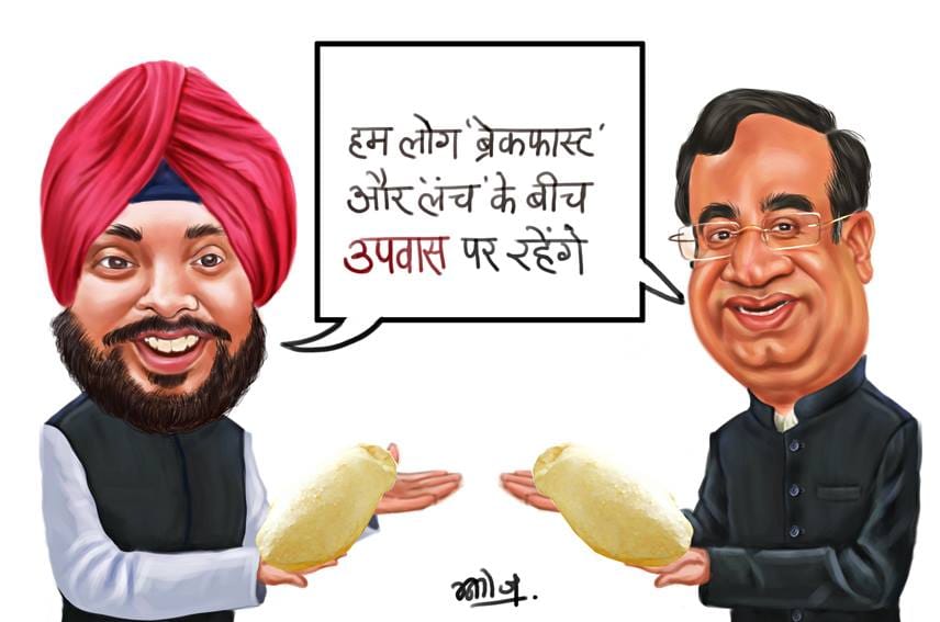 Manoj Sinha uses his cartoon to show the absurdity of these protests since Congress leaders were caught eating chhole-bhature before observing a “fast” for a few hours at Rajghat. Arvind Singh Lovely and Ajay Maken, two Congress leaders, were photographed at a restaurant enjoying a meal.