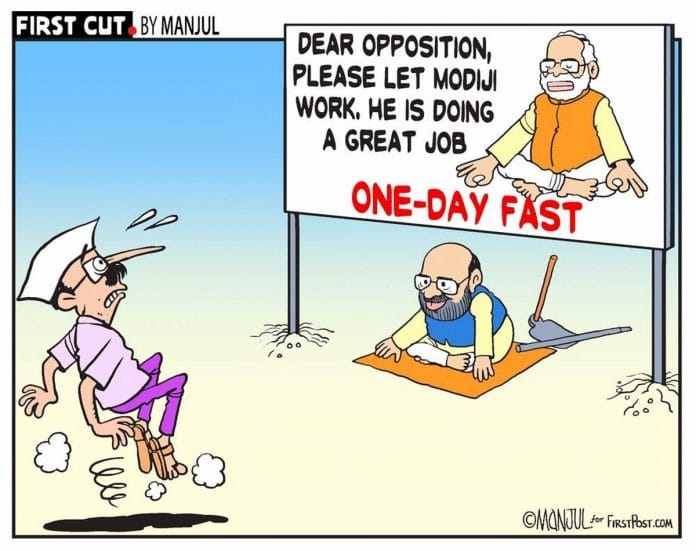 The dominant theme for cartoons today are the various fasts being organised by the Congress and BJP over different issues. The lead cartoon by Manjul for Firstpost pokes fun at the recent fast observed by BJP president Amit Shah to protest against the disruptions during the recently concluded Budget Session of Parliament.