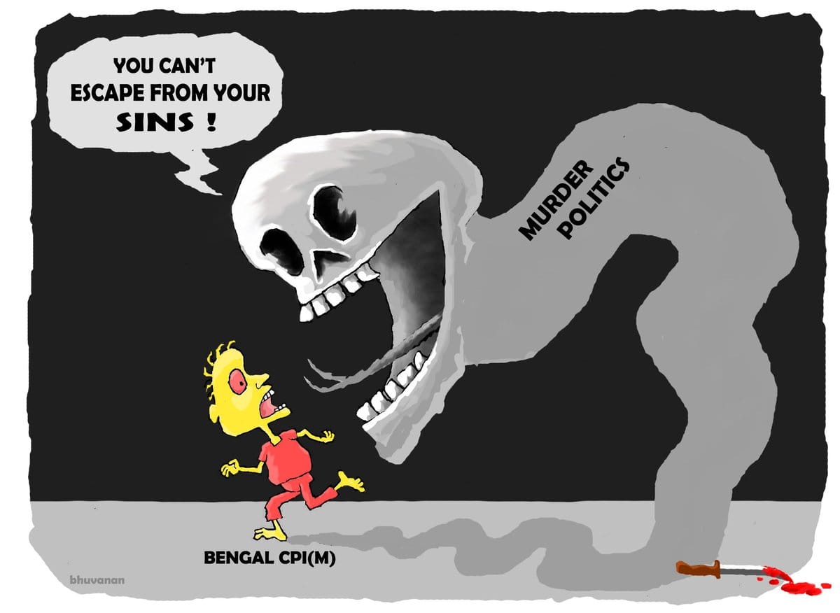 The next cartoon, by Bhuvanan, depicts the CPI(M) being chased by the ghost of ‘murder politics’ as the party blames the Mamata Banerjee-led TMC government in West Bengal for violence during the panchayat elections. The CPI(M) had, in its three-decade rule in the state, earned a reputation for unleashing violence during polls.