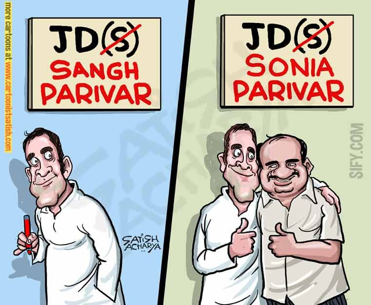 In the lead cartoon from Sify, Satish Acharya takes a dig at the power games being played in Karnataka, and the fact that long-time arch rivals Congress and JD(S) seem to have become best buddies to form the government in Karnataka.