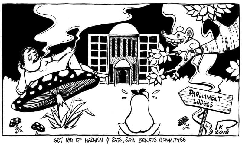 Lastly, Feica feeks in Dawn draws Pakistan as if it were a scene from Alice in Wonderland. The Senate Committee recently asked people to stop smoking hashish inside the Parliament Lodges. In the same committee meeting, the rat infestation in Parliament was also discussed.