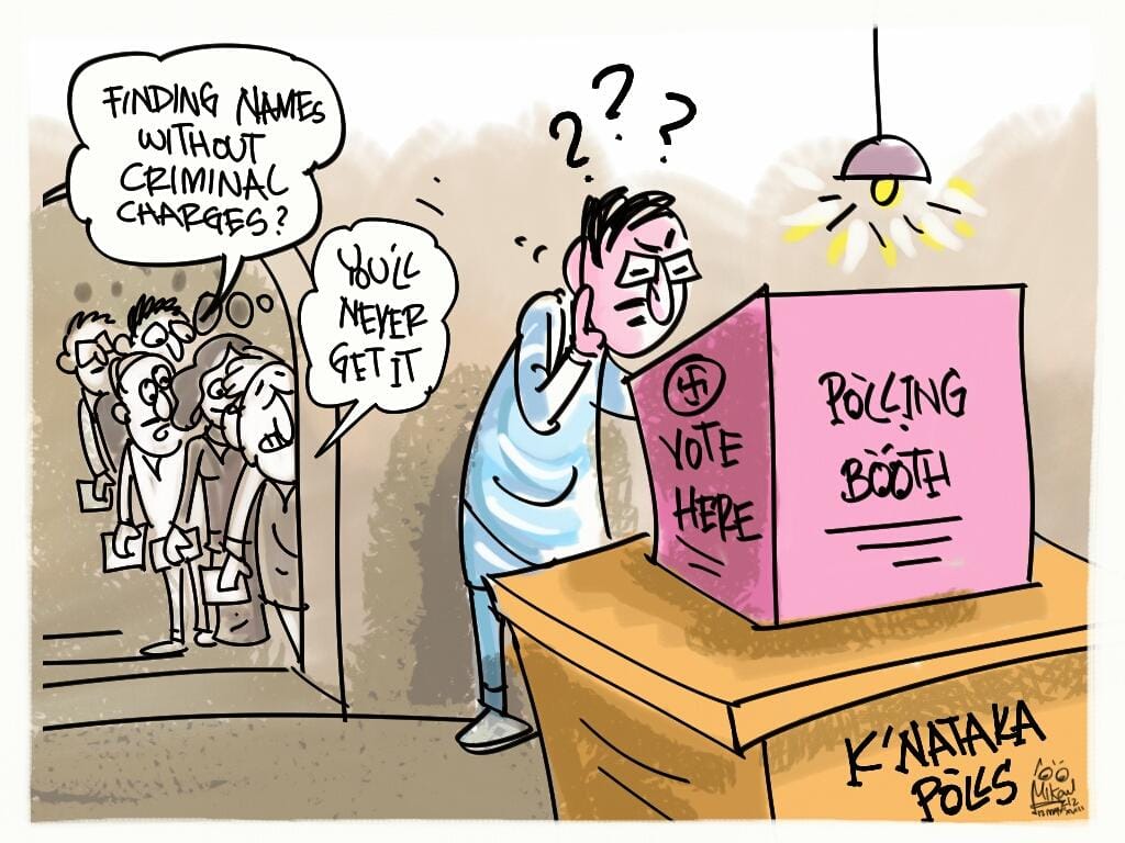 Mika Aziz on Twitter highlights the absurdity of the fact that many candidates contesting the Karnataka assembly elections have criminal charges against their name. The cartoon suggests that the nexus between power and political crime is so deep that it’s unlikely you’ll find even one innocent name on the EVM.
