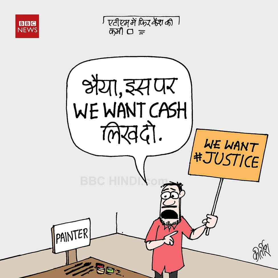 Mansoor Naqvi in Dainik Bhaskar says the ATM machines now asking for money instead of dispensing notes. Kirtish Bhatt in BBC Hindi shows people replacing protest placards from ‘we want justice’ to ‘we want cash’ in light of the shortage.