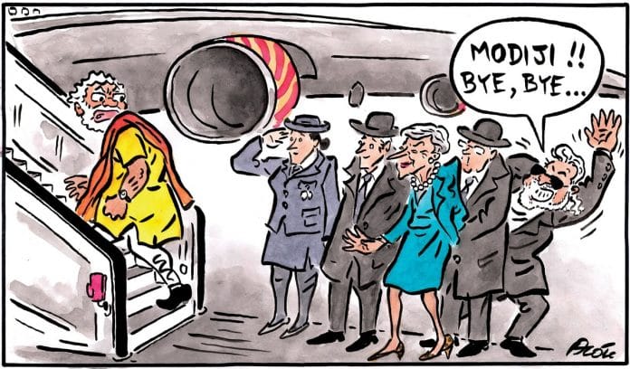 The lead cartoon by Alok Nirantar pokes fun at Narendra Modi’s recently concluded London trip, by showing the irony of the Prime Minister and fugitive businessman Vijay Mallya being in the same city.