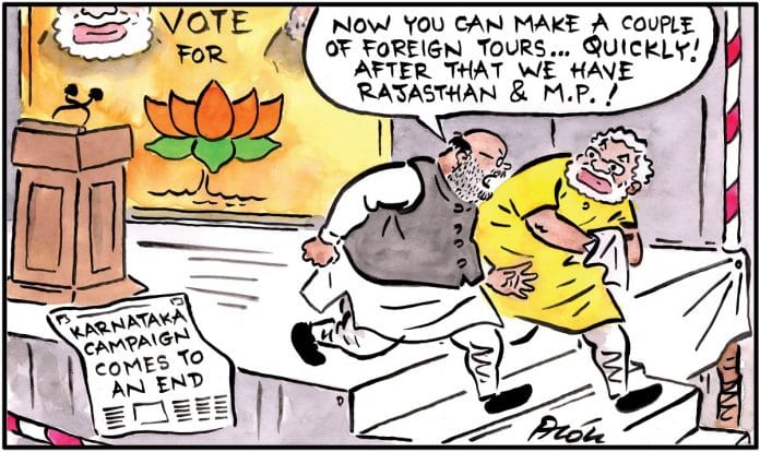 In the lead cartoon, Alok Nirantar suggests that the only thing that BJP president Amit Shah lets Narendra Modi do is campaign for elections and go on quick foreign tours. After the Karnataka poll campaign ended, Modi left for Nepal Friday.