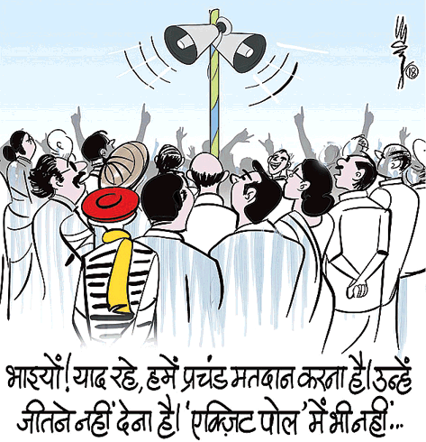 In Dainik Jagran, Madhav Joshi mocks election rallies, suggesting that politicians keep saying the same things at each one to try and convince voters.