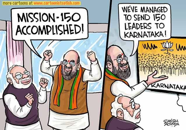 In Mail Today, Satish Acharya takes a jibe at the BJP’s ‘Mission-150’ in Karnataka, a plan to win over 150 of the state’s 224 assembly seats. However, according to the cartoonist, it looks like the BJP’s mission was to bring in as many ministers as they could to campaign for the party.