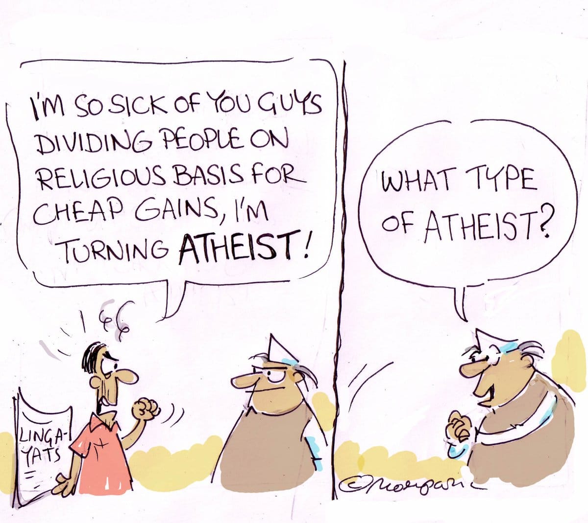 Sandeep Adhwaryu in Times of India and Hemant Morparia poke fun at BJP’s allegation that the Siddaramaiah-led Karnataka government was playing ‘divide and rule’ politics with its proposal to give Lingayats minority status. Both suggest that Indian politicians, from all parties, have been using divisive politics for too long to complain about it.
