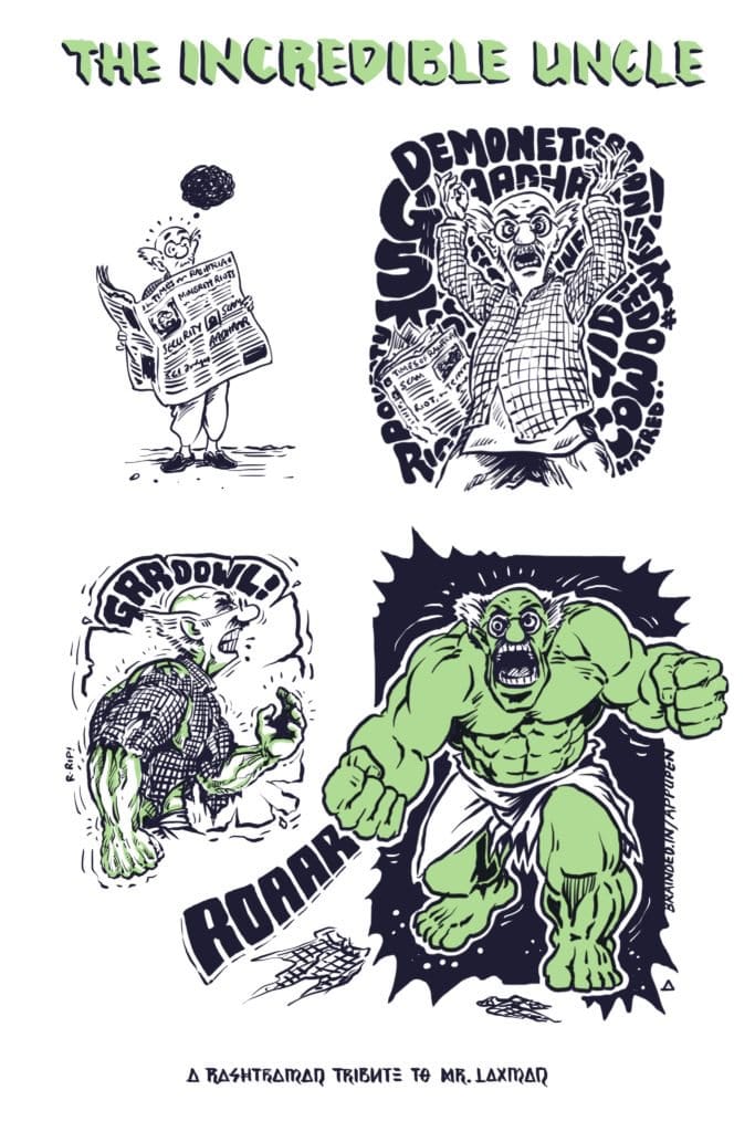 Appupen in News Laundry pays tribute to legendary cartoonist R. K. Laxman and his ‘common man’. He shows him becoming Hulk from a quiet Bruce Banner with the various pressures, like demonetisation, GST, Aadhaar linking, on the common man.