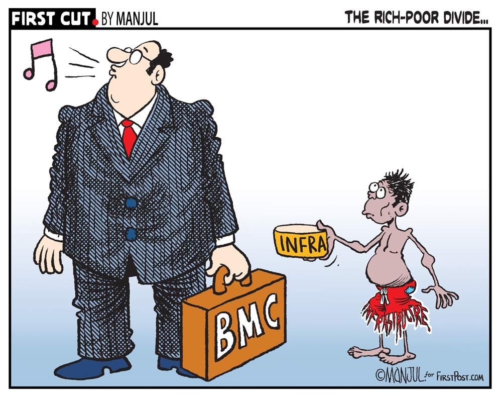 Heavy showers hit Mumbai Tuesday and brought the Maximum City to a virtual halt. The entire episode once again showed the disparity between BMC’s actual budget and the amount it allots to infrastructure. Manjul illustrates for FirstPost
