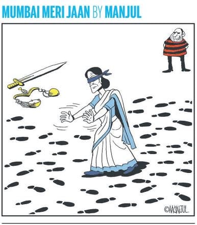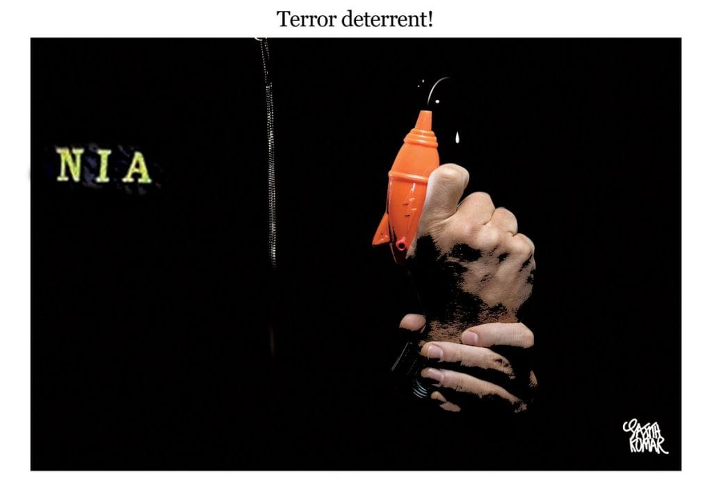 Cartoonist Sajith Kumar commented on the failure of the NIA to get a conviction in the case with a saffron water gun to take on terror. Manjul in Mid-day shows justice in the aftermath of the verdict, walking about looking for her tools.