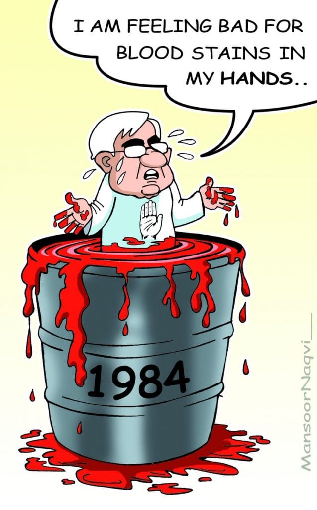 Former union minister Salman Khurshid recently said that the Congress has the blood of Muslims on their hands. Mansoor Naqv’s cartoon on Twitter refers to the 1984 riots to show that the Congress is actually steeped in the blood of Sikhs, so Khurshid’s statement is just the tip of the iceberg when it comes to Congress’ past “sins”.