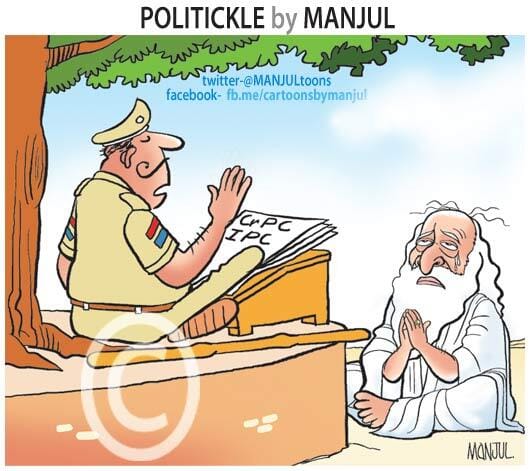 In the lead cartoon by Manjul for DNA, the tables have turned on self-styled godman Asaram Bapu as the rule of law is superior to his status as a ‘spiritual leader’. Asaram sits in fearful veneration of a police officer, who is guiding him to abide by CrPC and IPC.