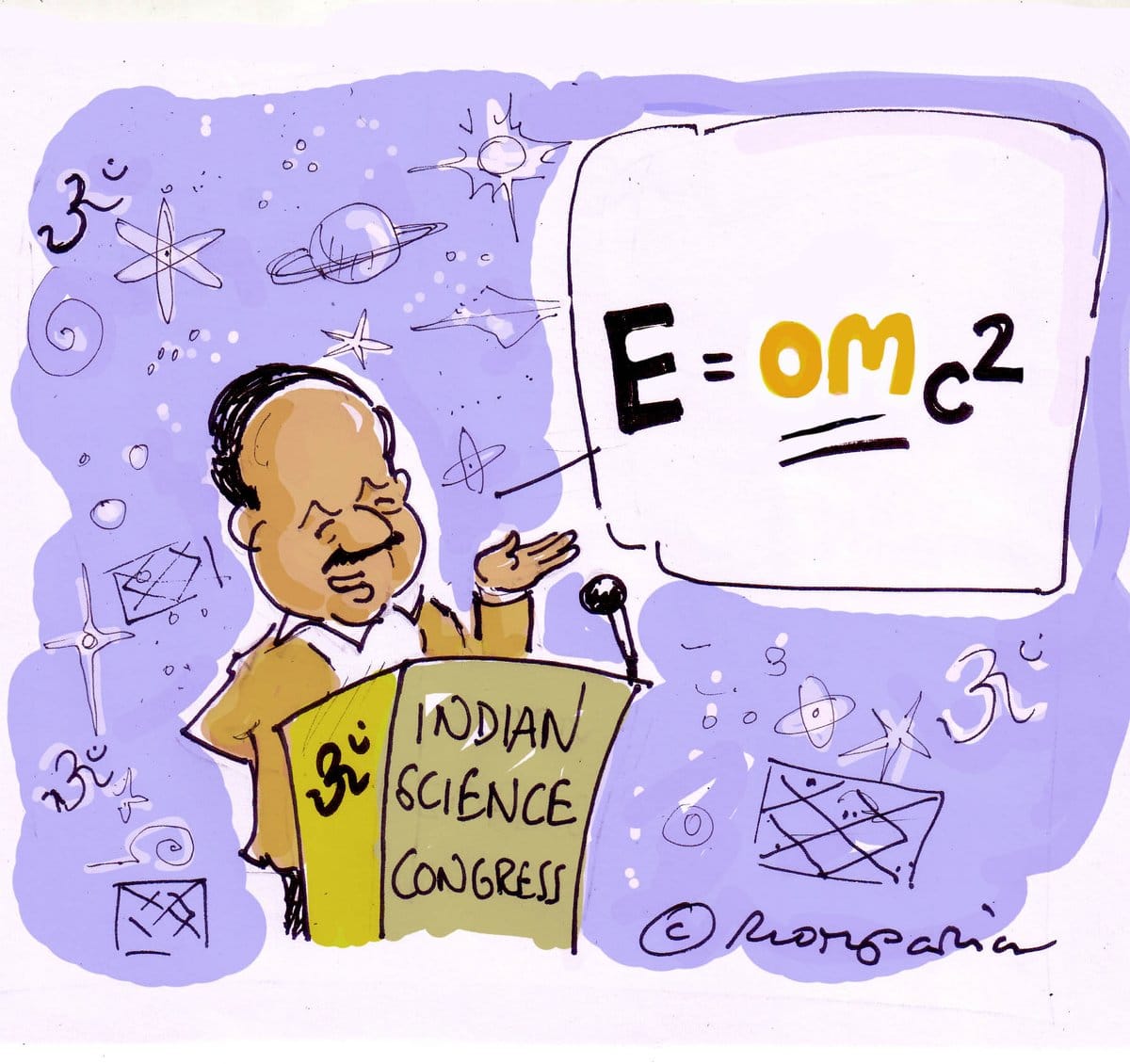 Union Science and Technology Minister Harsh Vardhan claimed at the Indian Science Congress that cosmologist Stephen Hawking had “emphatically said that on record that our Vedas might have a theory which is superior to Einstein’s theory of E=mc2.” Cartoonist Hemant Morparia takes a dig at Vardhan’s ludicrous statement that has since been sourced to a fake Facebook account bearing the physicist’s name.