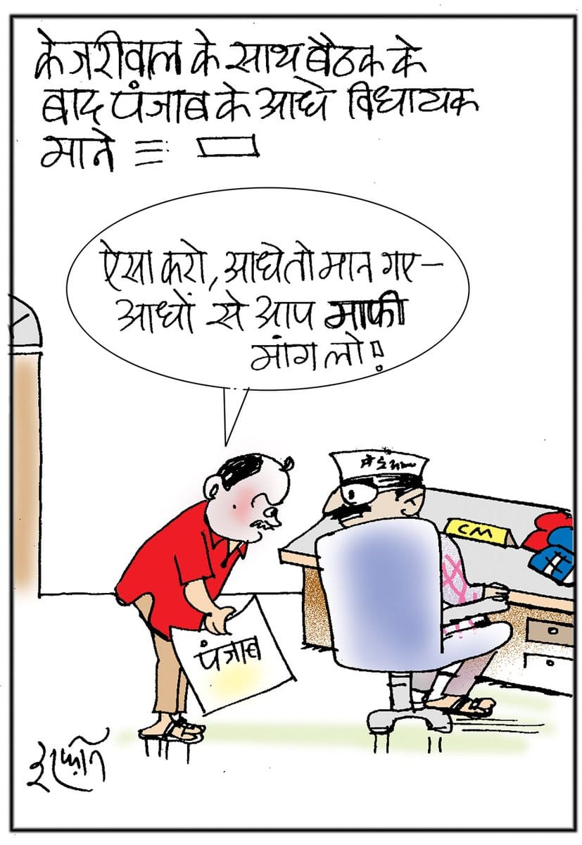 In his cartoon in Hindi, cartoonist Irfan deals with AAP chief Arvind Kejriwal’s apologies to those he criticised earlier. While Kejriwal’s apology to former Punjab minister Bikram Singh Majithia split the party’s Punjab unit, an official has a suggestion to placate those upset by it.