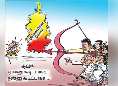 Karna in Dinamalar shows a befuddled Narendra Modi wondering why the opposition, which never seems to find common ground on anything else, only united to propose a no-confidence motion against the BJP in Parliament.