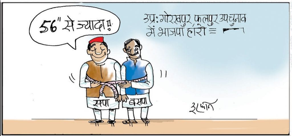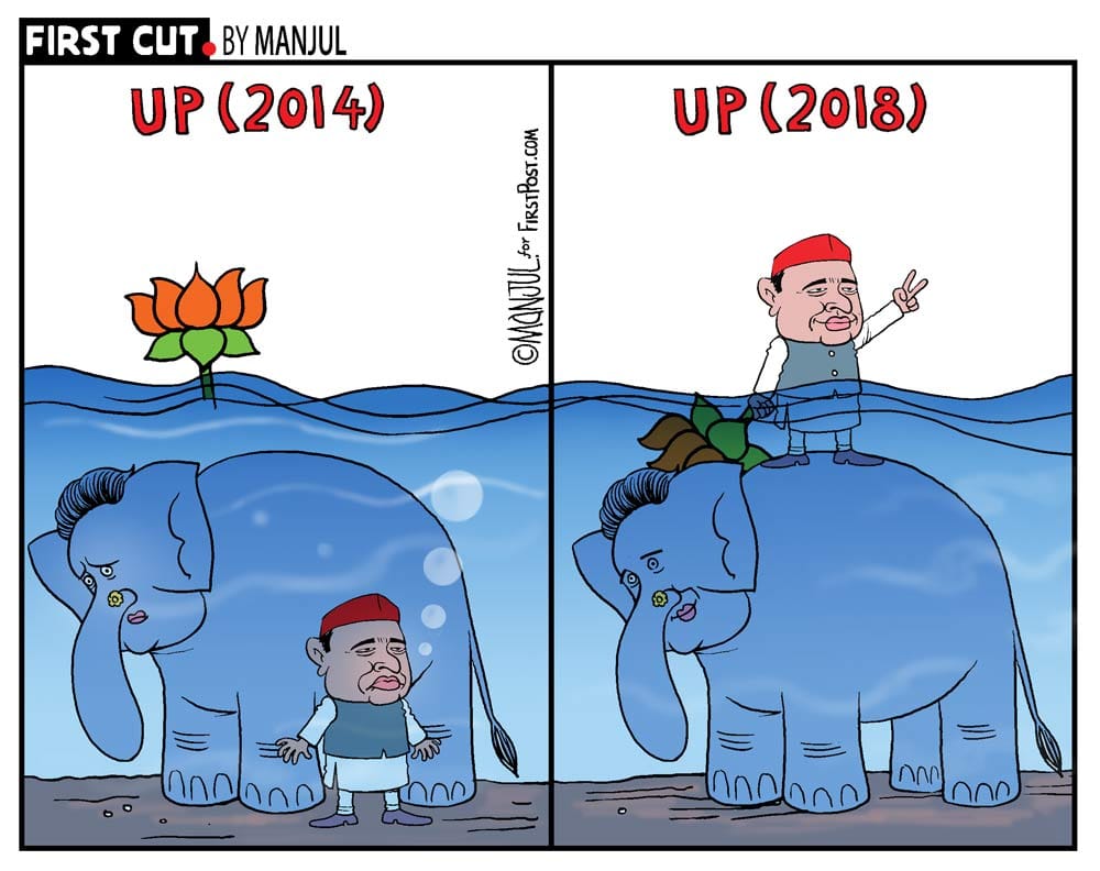 Finally, Manjul in First Post intelligently encapsulates the changed political dynamic between the SP, BSP and BJP in Uttar Pradesh. In 2014, the BJP had floated to the top of the pile, while rivals SP and BSP drowned in losses. Now, as SP and BSP have struck a symbiotic relationship, they rise to the top together in 2018, as the BJP is held-back from victory.