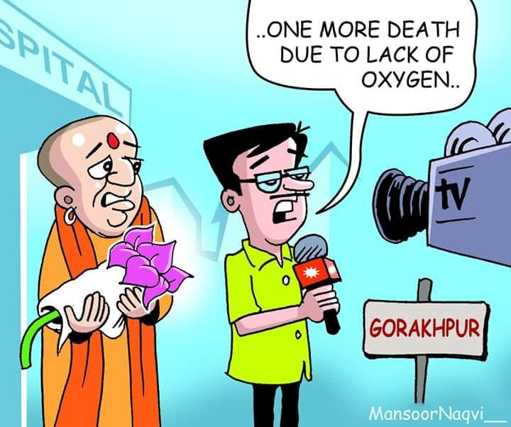 Mansoor Naqvi in DB Post alludes to the large number of children that died in BRD Medical College hospital in Gorakhpur due to a lack of oxygen last year. Now once again under Yogi Adityanath’s leadership, the death is of the BJP, as the chief minister stands crestfallen with a wilting lotus in his arms (the BJP logo).