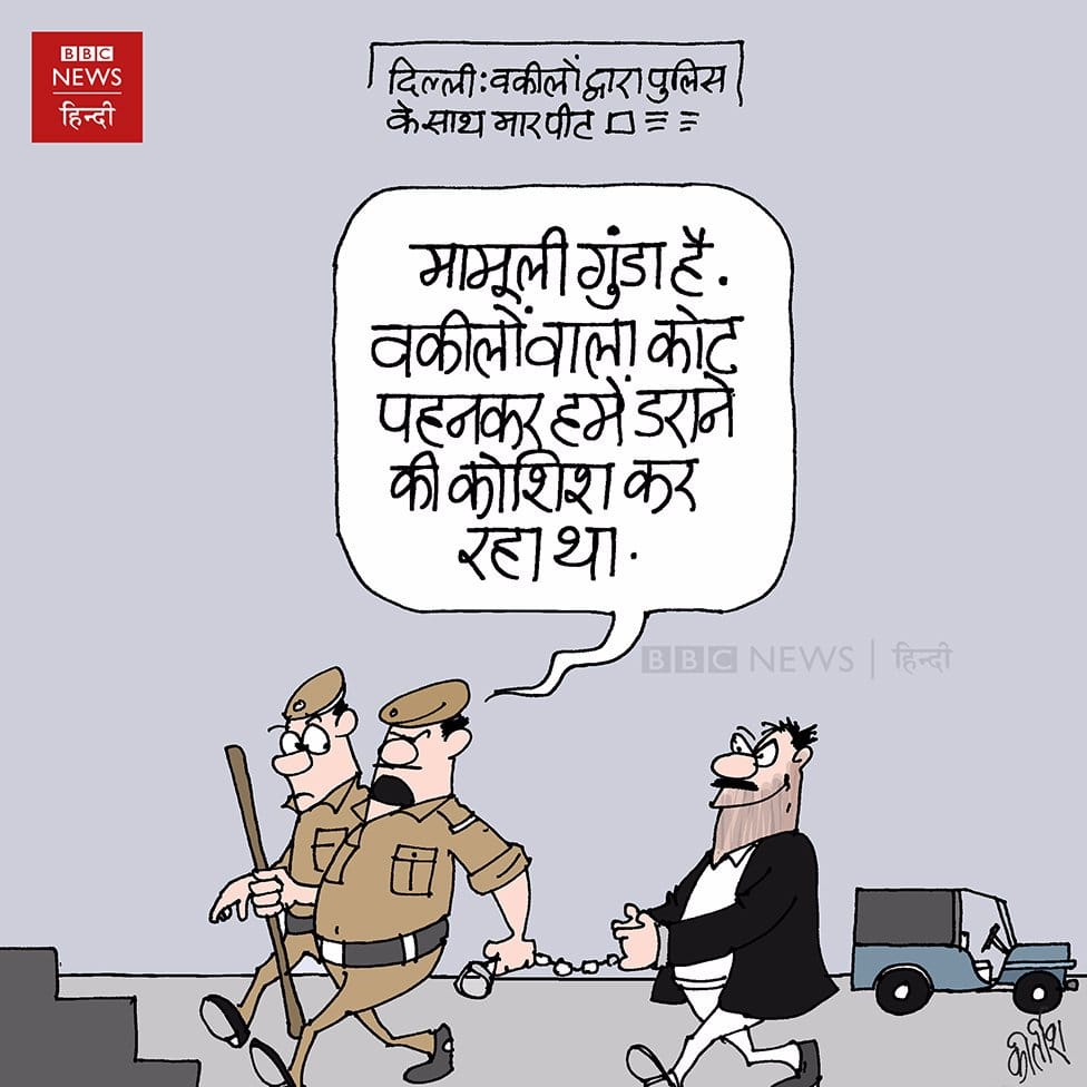 In today’s featured cartoon, Sandeep Adhwaryu makes a comment on the scuffle that broke out between Delhi Police and lawyers in Tis Hazari Court last week. The cartoonist draws B.R. Ambedkar, Jawaharlal Nehru, Mahatma Gandhi and Sardar Vallabhbhai Patel to comment on the issue.