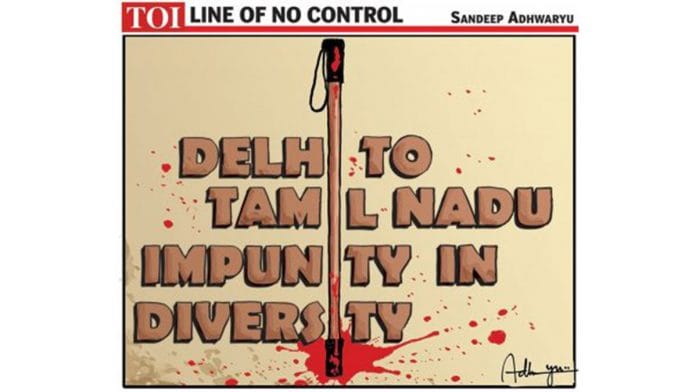 In today’s featured cartoon, Sandeep Adhwaryu highlights police brutality across the country, which was recently brought to the fore by the custodial deaths of P. Jayaraj and Bennix in Tamil Nadu. They were allegedly tortured to death by the Tamil Nadu Police.