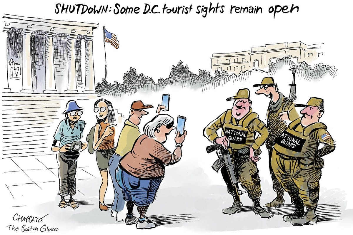 The selected cartoons appeared first in other publications, either in print, online, or on social media, and are credited appropriately.