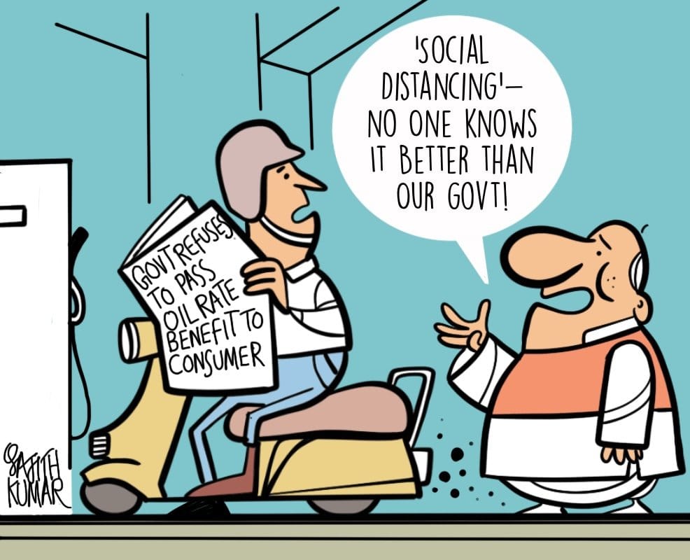 Sajith Kumar takes a dig at the Modi government for refusing to slash oil prices for the consumer even as global crude oil prices fell.