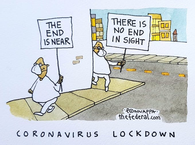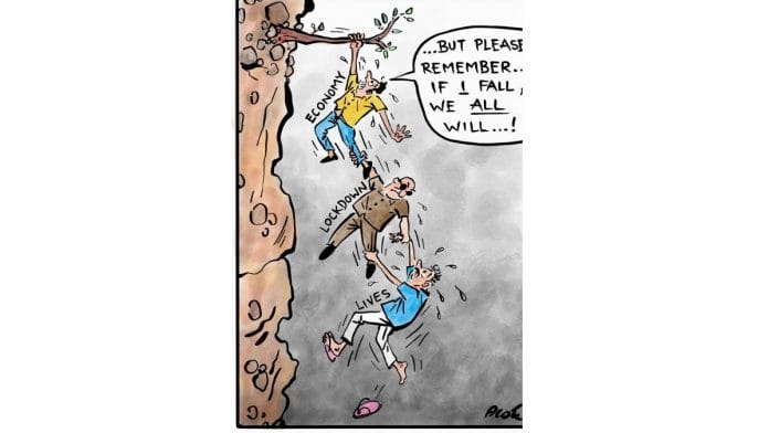 In today’s featured cartoon, Alok Nirantar illustrates the thin thread by which the economy, lives and the lockdown hang.