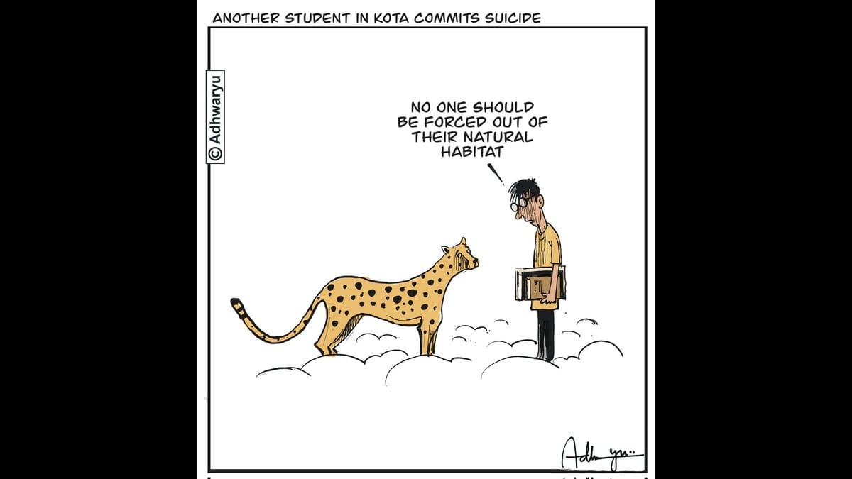 Here, Sandeep Adhwaryu alludes to the suicide of a 17-year-old boy who arrived in Kota last week to prepare for the medical entrance exam NEET. He illustrates this with cheetahs imported from Namibia. Survival of the fittest, indeed!