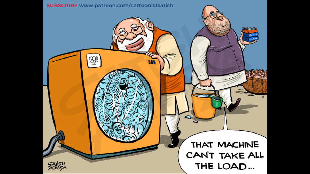 Satish Aarya playfully exposes the BJP’s magical “washing machine” that miraculously scrubs away all the legal troubles of politicians when they switch sides, as recently seen with NCP MLAs joining the NDA. Talk about an advanced spin cycle.