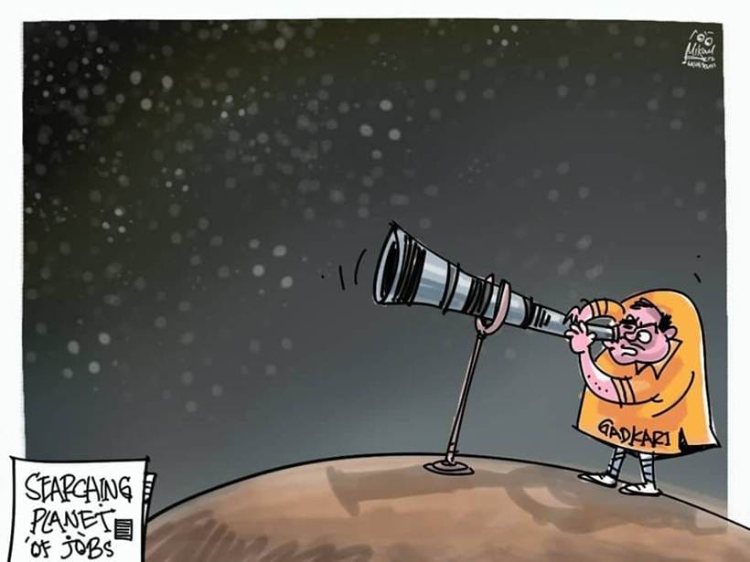 Union minister Nitin Gadkari Sunday commented that there are hardly any jobs in the market so reservations for the Marathas is out of question. In The Indian Express, cartoonist Mika illustrates Gadkari looking for jobs on other planets.