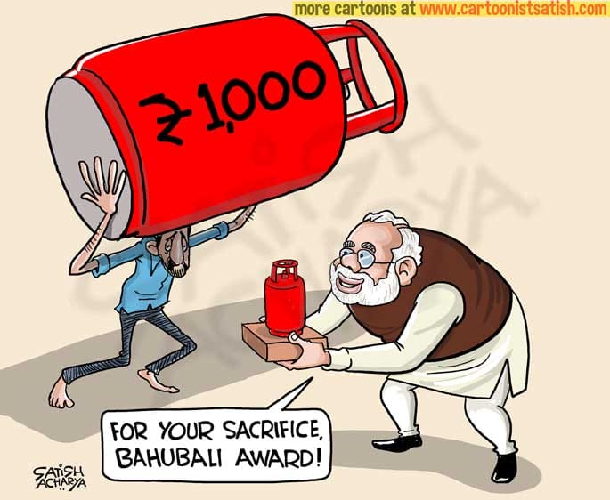 Satish Acharya takes a caustic remark at the Modi government which has burdened the common man with price rise — the latest one applies to LPG cylinder, which now costs Rs 1,000 a piece.