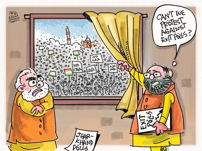 Mika Aziz depicts the Modi-Shah duo scrutinizing Jharkhand exit polls amidst the countrywide protests against the citizenship act.