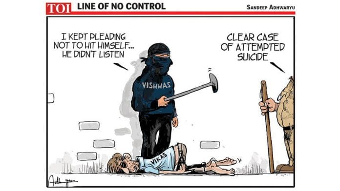 In today’s featured cartoon, Sandeep Adhwaryu takes a jibe at Modi’s “sab ka sath, sab ka vishwas, sab ka vikas” slogan as the promises of economic development remain unfulfilled.