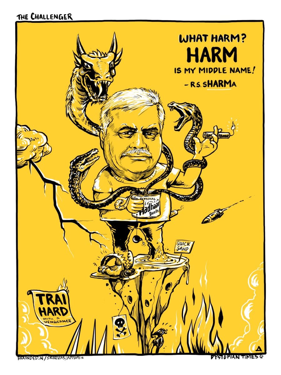 TRAI chairman R.S. Sharma challenging hackers on Twitter, who then used his Aadhaar number to reveal his personal details, continues to provide fodder for cartoonists. Here, Brainded India have their take on the row.