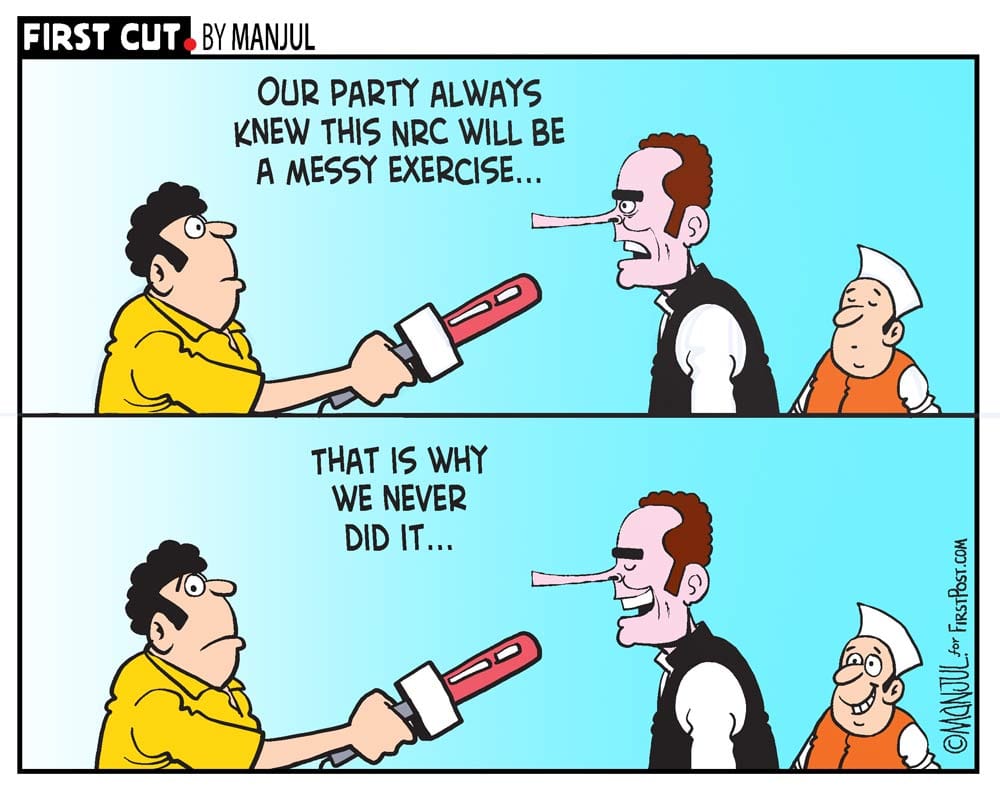 Cartoonist Manjul takes a dig at the Congress’ stand on the NRC. Many of the party’s leaders, including president Rahul Gandhi, have been playing up the fact that the entire exercise was initiated by a Congress government, while only finding fault with its implementation.