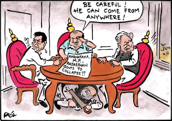 With BJP’s big win in Lok Sabha elections, Alok Nirantar caricatures the fear of Karnataka, Madhya Pradesh and Rajasthan chief ministers — H.D. Kumaraswamy, Kamal Nath and Ashok Gehlot, respectively — anticipating the ruling party’s manoeuvres to oust the Congress-led governments in these three states.