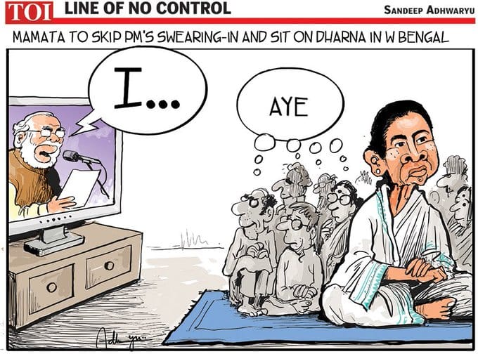 Sandeep Adhwaryu depicts West Bengal chief minister Mamata Banerjee decision to sit on a ‘dharna’ during PM-elect Narendra Modi’s swearing-in ceremony. The cartoonist adds to the punch by referring to this week’s development, as several TMC MLAs and municipal councillors joined the BJP.