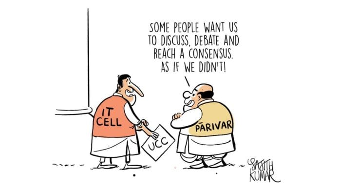 In today’s featured cartoon, Sajith Kumar emphasizes the central government’s lack of accountability, resulting from their exclusion of the country’s opinion on the matter, like UCC.