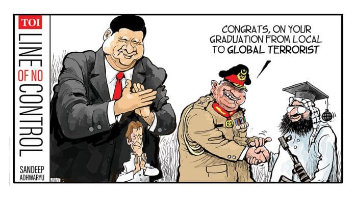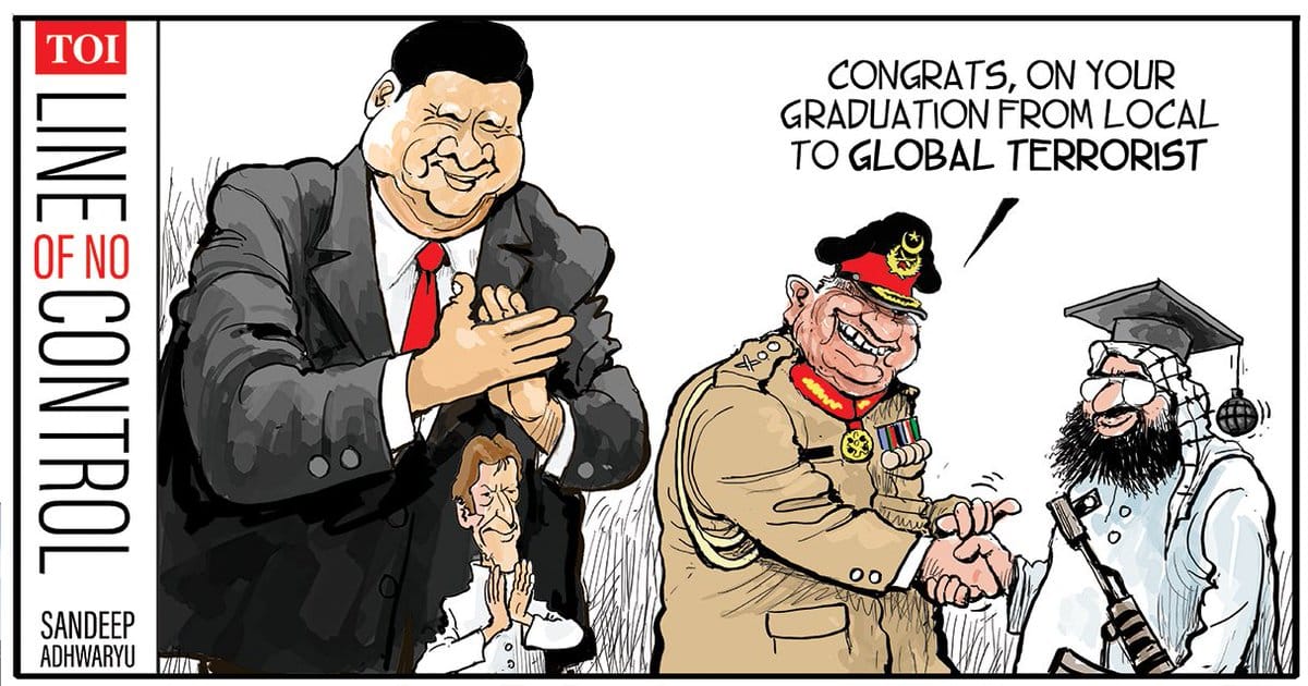 Sandeep Adhwaryu depicts Chinese President Xi Jinping, Pakistan Prime Minister Imran Khan and a Pakistan Army general congratulating Jaish chief Masood Azhar on his ‘promotion’ to being global terrorist after the UNSC move to enlist him.