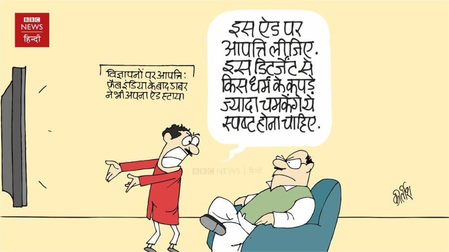 Kirtish Bhatt takes a dig at Hindutva groups and BJP leaders who are taking offence to advertisements. After Fabindia’s withdrawal of its “Jashn-e-Riwaaz” ad, Dabur consumer goods is the latest to withdraw an inclusive campaign on Karva Chauth showing a lesbian couple celebrating the festival. The man in the cartoon is telling his leader to take offence to a detergent ad, since it doesn’t specify which religion’s clothes are being washed.