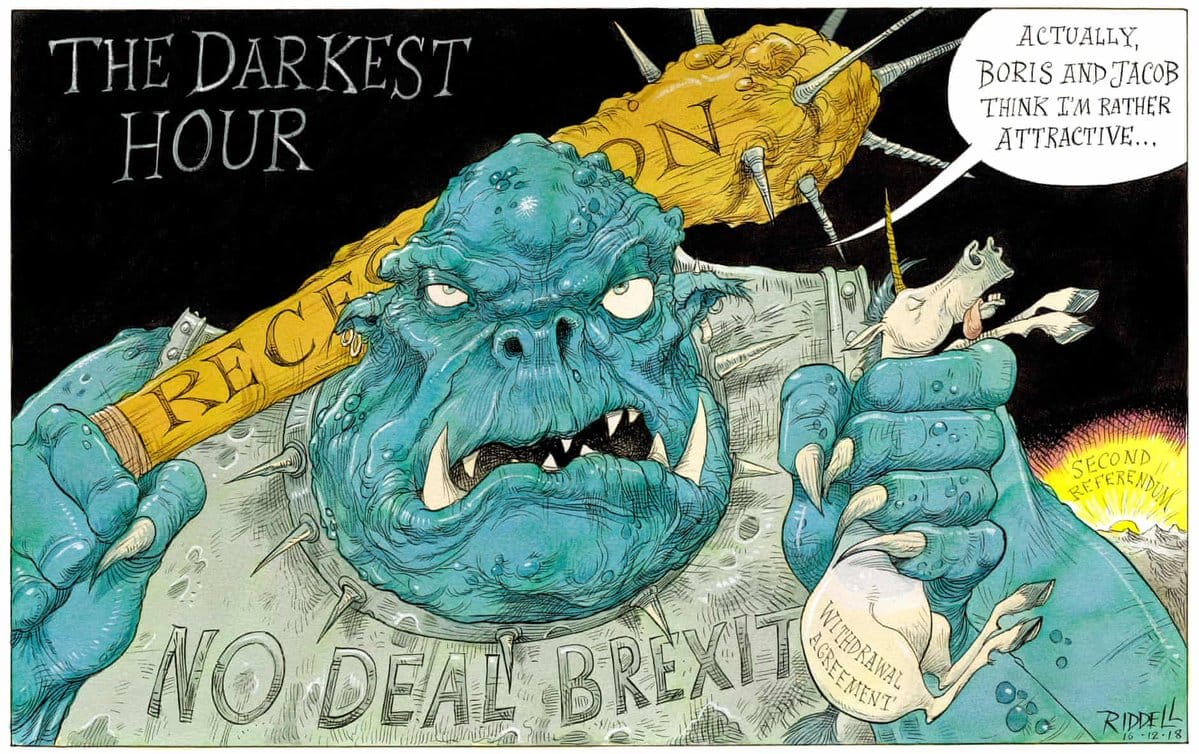 Chris Riddell weighs in on the speculation that a no-deal Brexit, which in effect would mean that the UK will leave the European Union without any proper trade or economic agreements, would lead the country into recession.