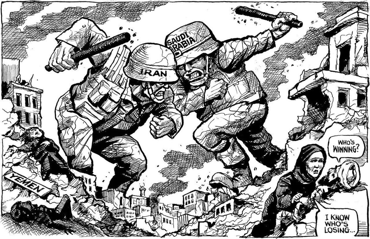 In The Economist, Cartoonist Kal suggests that the real victim of geo politics between Iran and Saudi Arabia is Yemen, where a civil war is raging between factions backed by both countries.