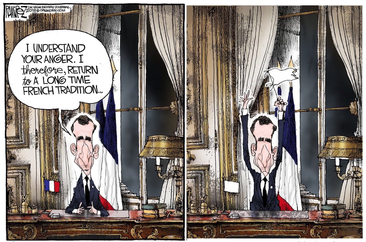 Cartoonist Mike Ramirez takes a jibe at French President Emmanuel Macron in the wake of nationwide demonstrations by the ‘Yellow Vests’. Thousands of protesters have taken to the streets demanding economic and social reforms, while accusing Macron of being a ‘President of the rich’.