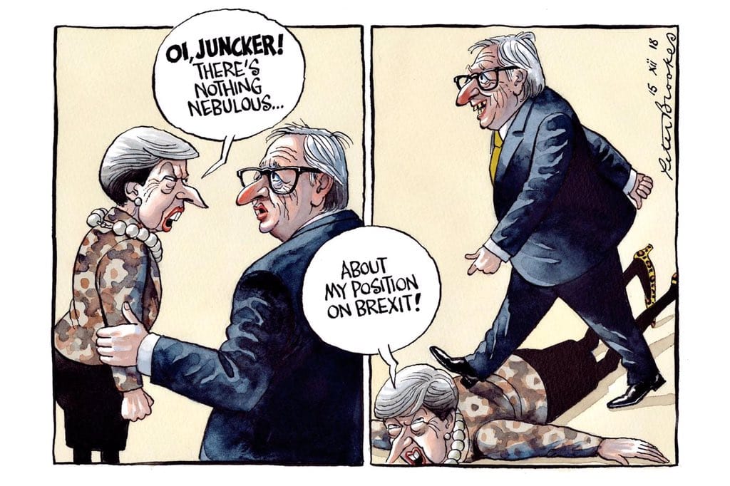 Peter Brookes in The Times reacts to European Commission President Jean-Claude Juncker describing British Prime Minister Theresa May as “nebulous” over her Brexit proposals. The Prime Minister later confronted Juncker over his comments.